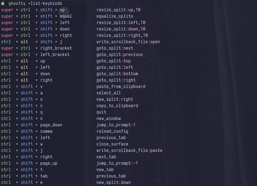 기본적인 keybinding은 ghostty +list-keybinds 명령으로 확인할 수 있습니다.
