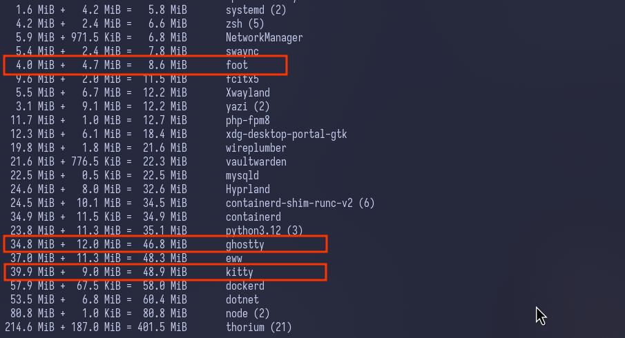메모리 사용량을 보면, 역시 foot이 넘사벽이죠? 8.6MiB 수준일때, kitty기 48.9MiB, 그리고 Ghostty가 46.8MiB 수준이니까.. foot 보다는 메모리 사용량이 많지만, kitty와는 대등하거나 약간 작은 수준임을 알 수 있습니다. 아무래도 GPU가속을 사용하기 때문에 그렇지 않은 터미널 보다 메모리를 많이 사용하는 것은 어쩔 수 없습니다.