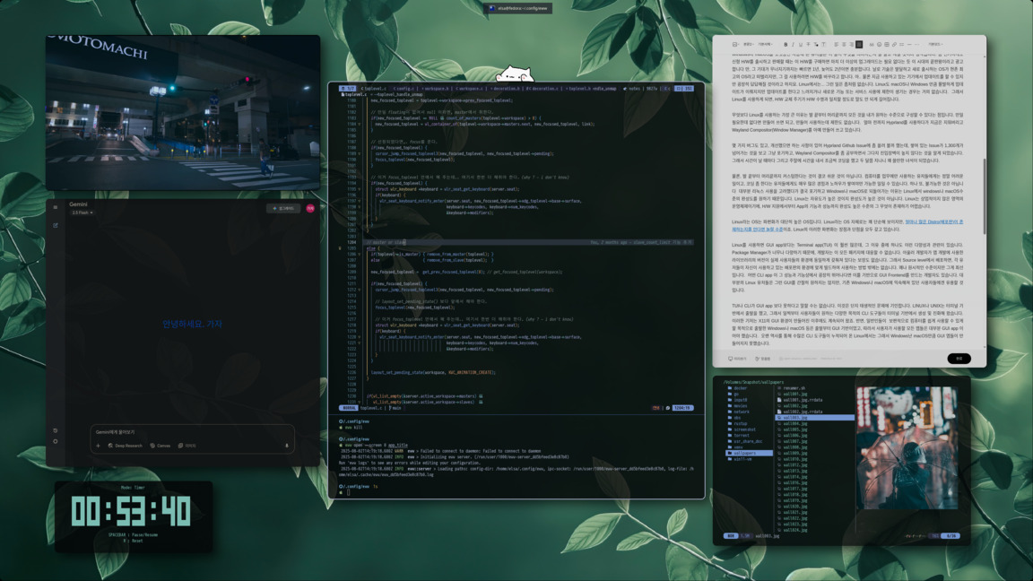 무엇보다 Linux를 사용하는 가장 큰 이유는 발 끝부터 머리끝까지 모든 것을 내가 원하는 수준으로 구성할 수 있다는 점입니다. 만일 필요한데 없다면 만들어 쓰면 되고, 만들어 사용하는데 제한도 없습니다. 얼마 전까지 Hyprland를 사용하다가 지금은 지워버리고 Wayland Compositor(Window Manager)를 아예 만들어 쓰고 있습니다.