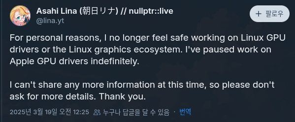 아울러, 지난번에 포스팅 했듯이 최근 팀의 리더였던 Hactor Martin의 리더 사임에 이어, 이번에는 GPU Driver 개발을 담당했던, Asahi Lina 가 공식적으로 개발을 잠정 중지한다고 발표 했습니다.