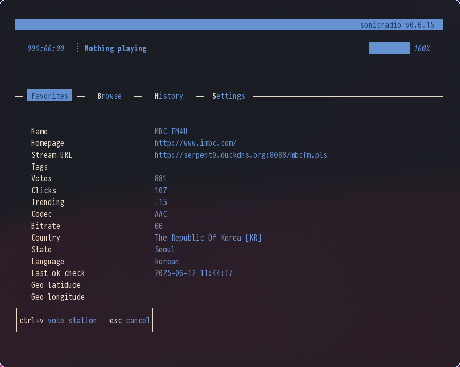 s(소문자 S)를 누르면 검색을 할 수 있습니다. 검색은 이름, tag, 국가, 언어 필드를 사용할 수 있으며, 검색 결과가 나온 경우 해당 항목에서 enter키를 치면 방송을 들을 수 있고, 즐겨 찾기를 하려면 f 키를 누르면 됩니다. 메인화면에서 F(대문자)를 눌러 즐겨찾기에서 언제든 사용할 수 있습니다.
