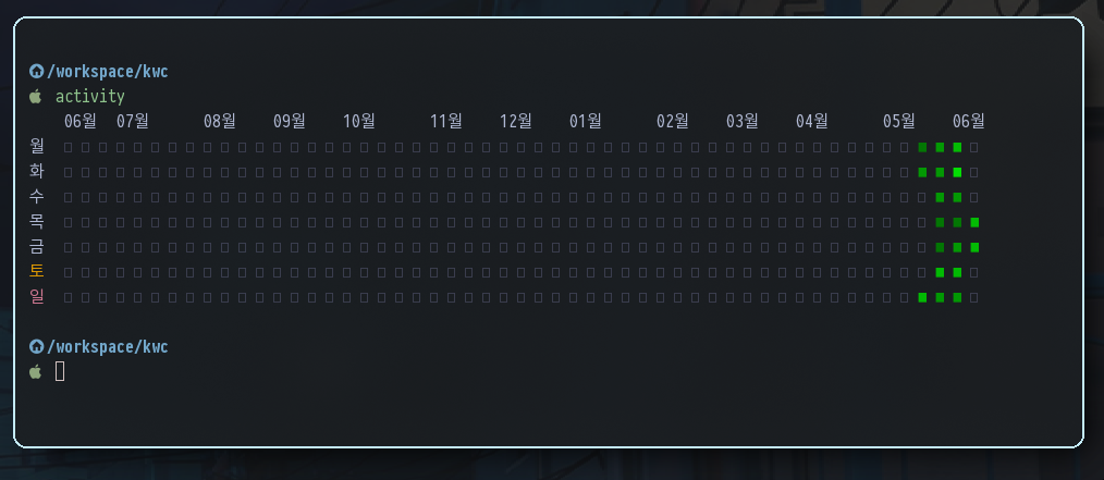 path에 빌드한 실행 파일을 복사한 후, git 소스코드 폴더에서 activity를 실행하기만 하면 됩니다. 녹색의 짙기는 5단계로 구분되며, 하루 동안에 몇 번의 commit을 했는가의 여부에 따라 활동 수준이 달라집니다. 밝은 녹색일수록 commit을 많이 한 것입니다.