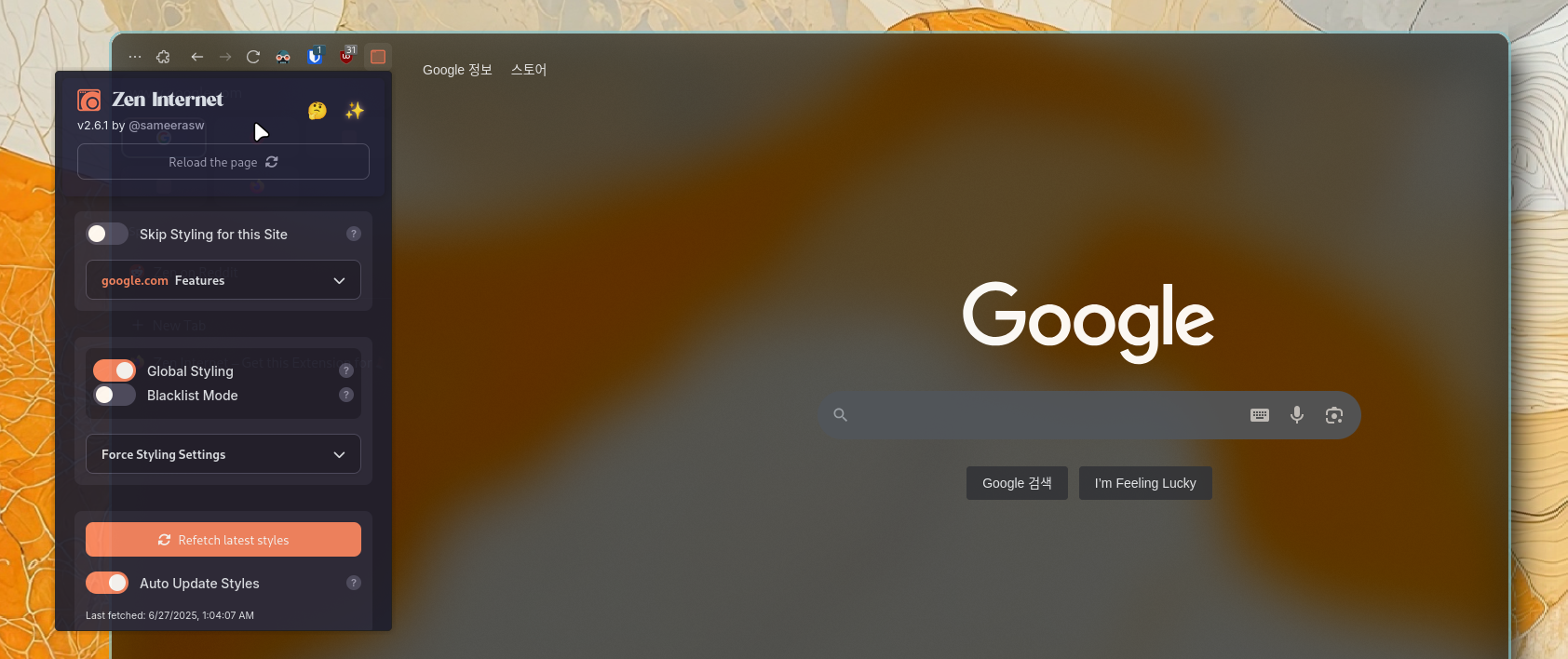 설치 후, 투명하게 보고 싶다면, 아래와 같이 Zen internet Extension Icon을 누르고, 적용을 활성화시켜 주면 투명이 적용됩니다.