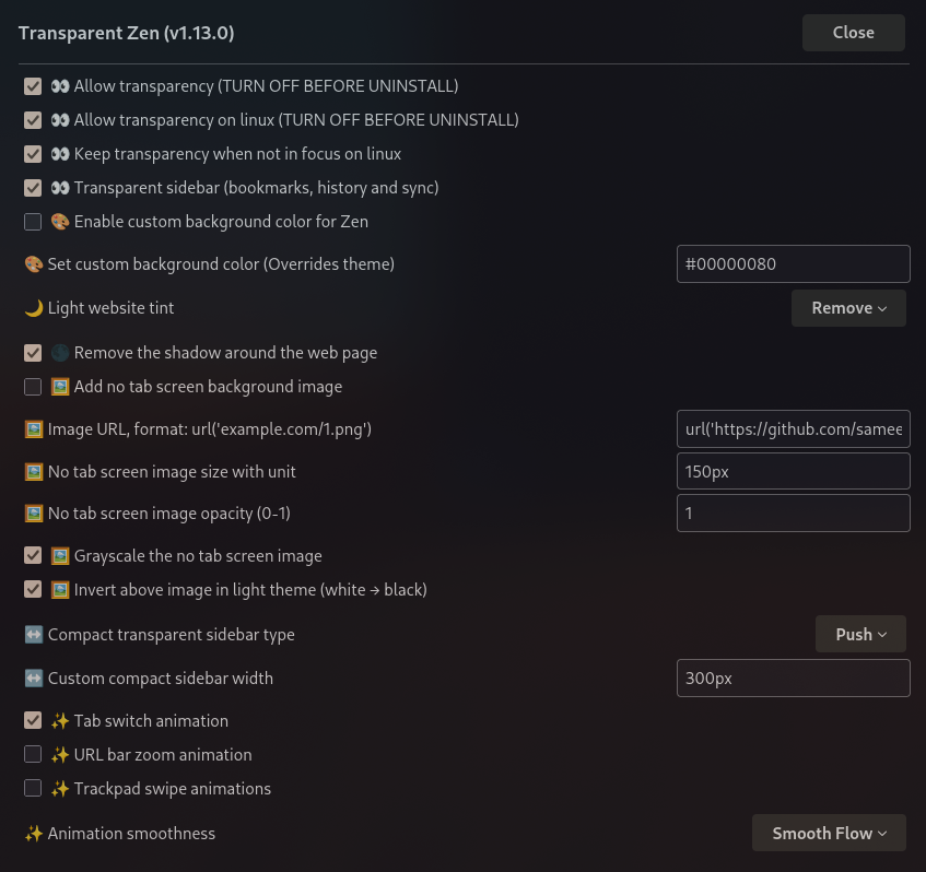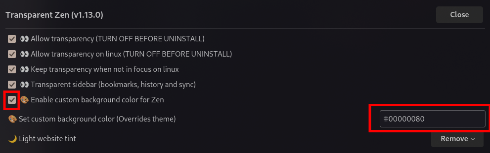 그리고, 투명화가 되었을 때 홈페이지에 표시되는 글씨들이 배경에 묻혀 가독성이 떨어질 수 있기 때문에, Enable custom background color for zen을 활성화하고, Set Custom background color를 #00000080으로 설정합니다. 000000은 검정색을 의미하며 80은 투명도로 50% 정도의 반투명을 의미합니다. (값은 Hex로 00 ~ FF, 80은 중간값)