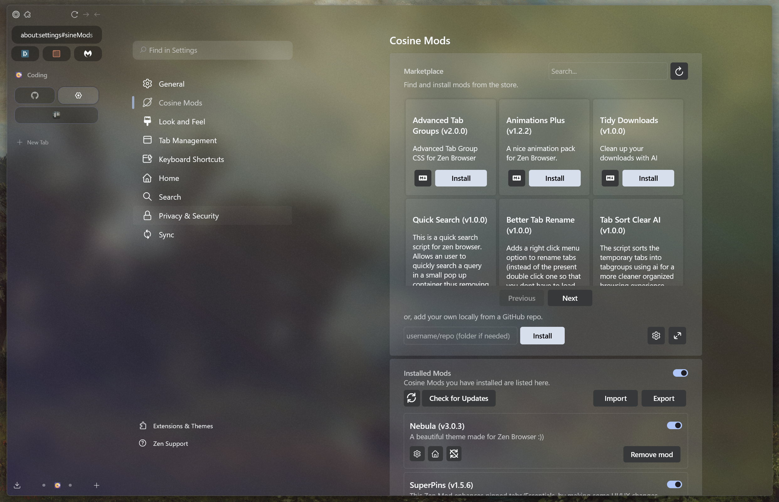 이제, Zen을 실행하고, 설정으로 가면 아래와 같이 Sine Mods 항목이 새롭게 등록이 된것을 알 수 있습니다.