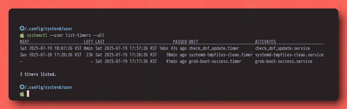 끝으로, systemd의 timer 유닛 목록과 관련된 정보를 한눈에 확인하려먼, systemctl --user list-timers --all 명령을 내리면 됩니다.