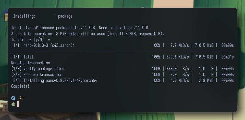 위의 스샷은 nano 라는 패키지를 설치하는 예입니다. 설치할 패키지가 nano 딱 한 개 인 것을 보면 추가적으로 설치할 종속성 패키지는 없는 것을 알 수 있습니다. 설치는 711 KiB 이고, 다운로드할 크기도 동일합니다. 하지만 실제 설치될 크기는 3 MiB 임을 알 수 있죠. 그리고, [y/N] 으로 사용자의 선택을 대기합니다.