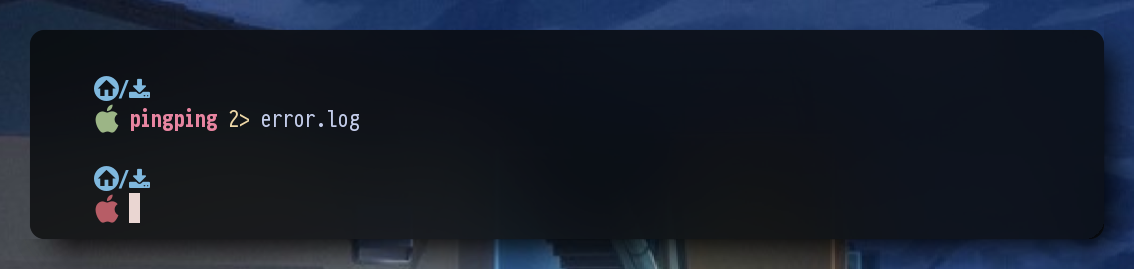 pingping이라는 명령은 없기 때문에 표준에러로 에러메시지를 출력하게 되는데, 앞서 언급했듯이 에러 메시지는 동일하게 terminal로 출력을 하지만 file descriptor가 2번 입니다. 즉, 2> 라는 의미는 표준에러 스트림만 error.log로 redirection 하게 됩니다.
