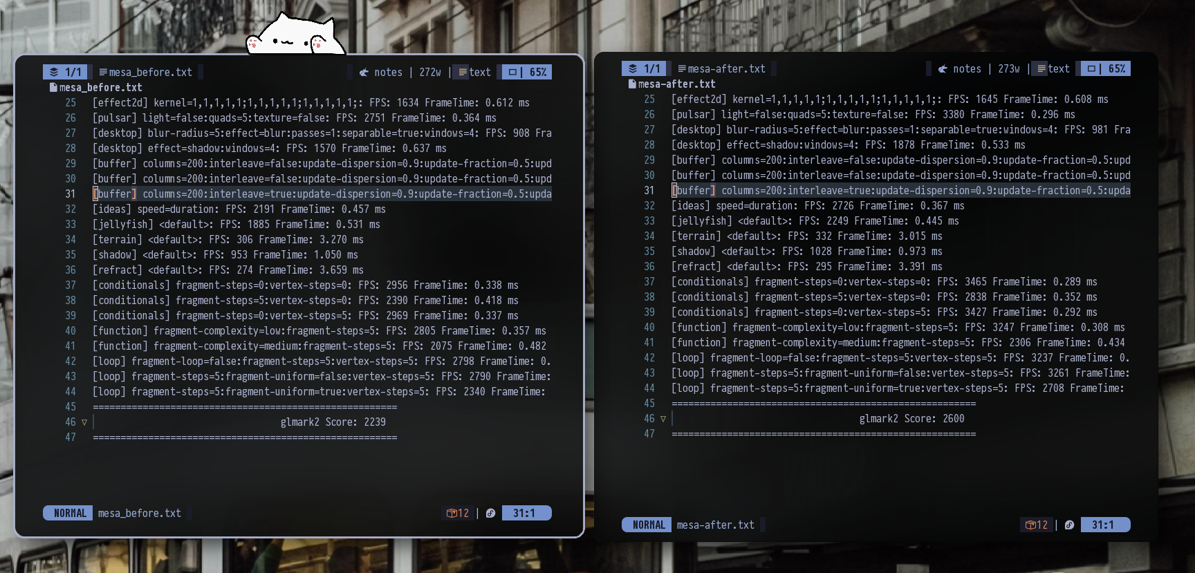 소스코드를 다운로드 받아 빌드 및 업데이트한 후에 성능 비교를 해 봤습니다. 간단히 glmark2-wayland로 테스트를 해 봤는데요. 기존 버전인 Mesa 25.1.0의 glmark2 score는 2239점, 그리고 금번 25.2.0 버전의 점수는 2600점으로 대략 16% 정도 향상된 것으로 확인되고 있습니다.