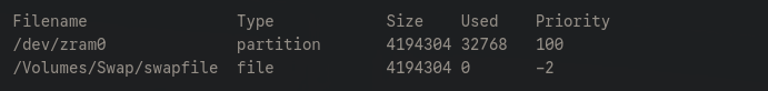 zram + swap에서는 1차 swap, 2차 swap 장치의 개념이기 때문에, 우선 1차 swap 인 zram을 먼저 사용하고 zram이 가득 차면 zram은 그대로 놔두고 2차 swap인 디스크 swap을 보조적으로 사용하는 방식입니다. 즉, 사용빈도가 비교적 더 높은 가장 최근의 데이터 페이지가 오히려 더 느린 디스크 swap 장치에 저장될 수 있다는 단점이 있는 것입니다.