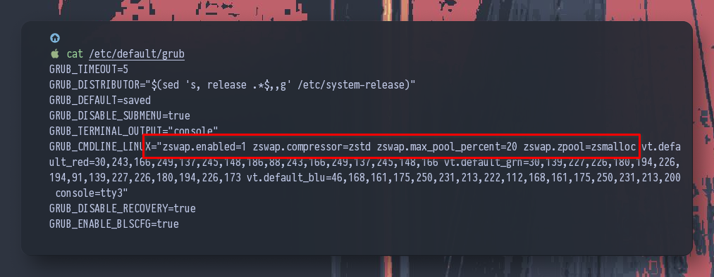 마지막으로 확인해야 할 것은 kernel booting 옵션입니다. kernel의 부팅 옵션에 zswap과 관련된 kernel parameter가 명시되어 있어야 하는데, 이를 확인하는 방법은 아래와 같습니다.