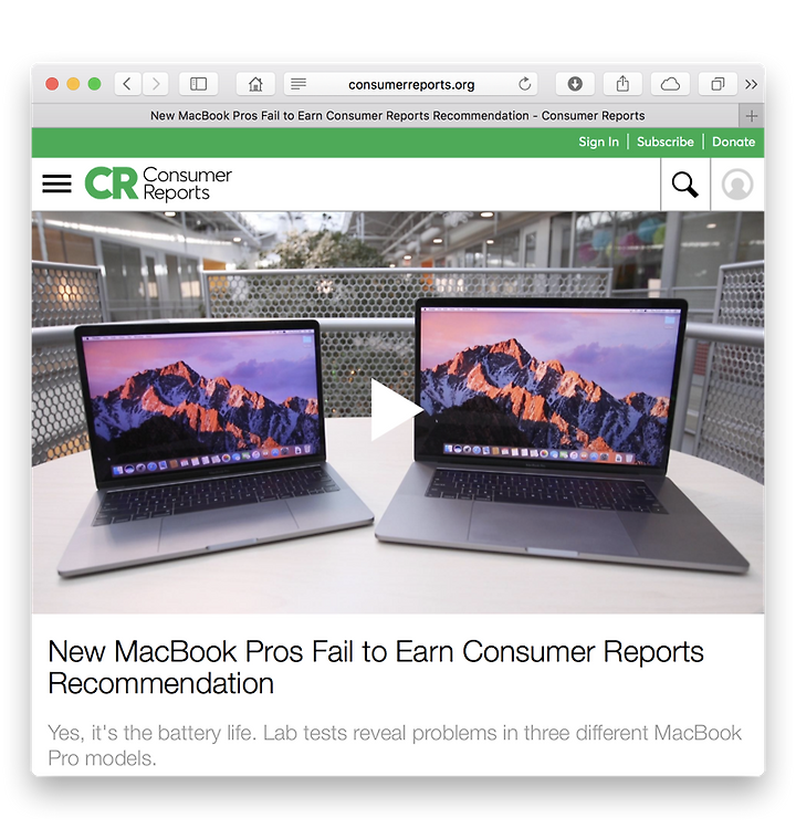 신형 맥북의 출시 이 후, 여러가지 잡음에도 불구하고 최고의 판매량을 올리고 있다는 소식이 전해오고는 있지만, 최근 Consumer Reports가 실시한 평가에서 신형 MacBook Pro(late 2016)의 배터리 소모시간의 둘쑥날쑥한 차이로 말미암아 MacBook Pro 제품 역사상 최초로 Consumer Reports의 추천을 받지 못하는 사태가 발어지면서 여기저기서 말들이 많습니다.