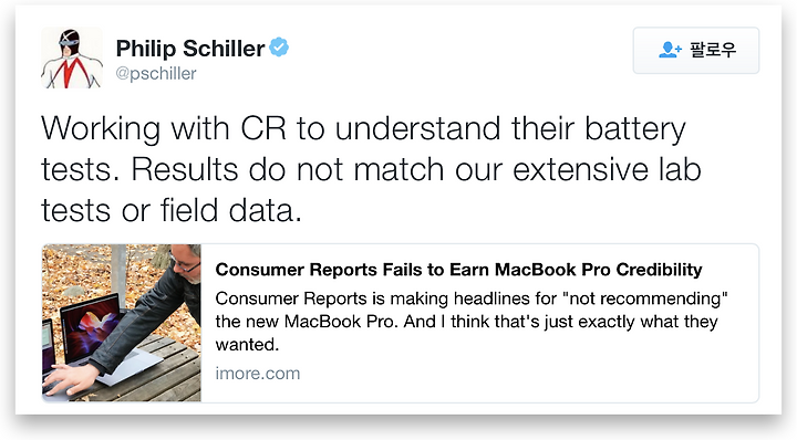 최초 CR에서 해당 문제를 보도하면서 한동안 애플에서 이에 대한 공식적인 언급이 없어서, 배터리 성능과 소모전력 사이에서 많은 사용자들의 의구심을 자아내게 했었는데, 오늘 애플의 마케팅 담당 SVP인 Phil Schiller가 Consumer Reports의 배터리 테스트 결과에 대한 첫 언급을 내 놓았습니다.