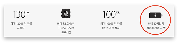 - 테스트는 2016년 10월 Apple에서 256GB SSD 및 16GB RAM을 탑재한 2.6GHz 쿼드 코어 Intel Core i7 기반 15형 MacBook Pro 시제품, 512GB SSD 및 8GB RAM을 탑재한 2.9GHz 듀얼 코어 Intel Core i5 기반 13형 MacBook Pro 시제품(무선 웹 테스트 및 iTunes 동영상 재생 테스트), 256GB SSD 및 8GB RAM을 탑재한 2.9GHz 듀얼 코어 Intel Core i5 기반 13형 MacBook Pro 시제품(대기 모드 테스트), 그리고 256GB SSD 및 8GB RAM을 탑재한 2.0GHz 듀얼 코어 Intel Core i5 기반 13형 MacBook Pro 시제품을 사용하여 진행했습니다. 무선 웹 테스트는 디스플레이의 밝기를 제일 어두운 상태로부터 12단계 밝게 한 상태 혹은 75%로 설정한 상태에서 무선으로 인기 웹사이트 25곳을 방문하는 방식으로 배터리 사용 시간을 측정했습니다. iTunes 동영상 재생 테스트는 디스플레이의 밝기를 제일 어두운 상태로부터 12단계 밝게 한 상태 혹은 75%로 설정한 상태에서 HD 1080p 콘텐츠를 재생하는 방식으로 배터리 사용 시간을 측정했습니다. 대기 모드 테스트는 시스템을 무선 네트워크에 연결하고 iCloud 계정에 로그인한 후 Safari와 Mail 응용 프로그램을 실행하고 모든 시스템 설정을 기본으로 설정한 상태에서 대기 모드로 전환하여 그 상태의 배터리 사용 시간을 측정했습니다. 배터리 사용 시간은 사용 패턴 및 설정에 따라 다를 수 있습니다. 자세한 내용은 www.apple.com/kr/batteries를 참고하십시오.