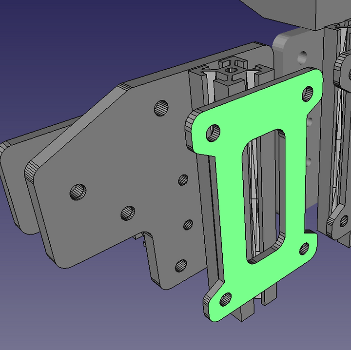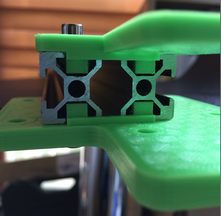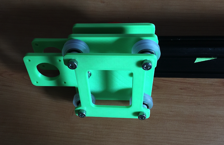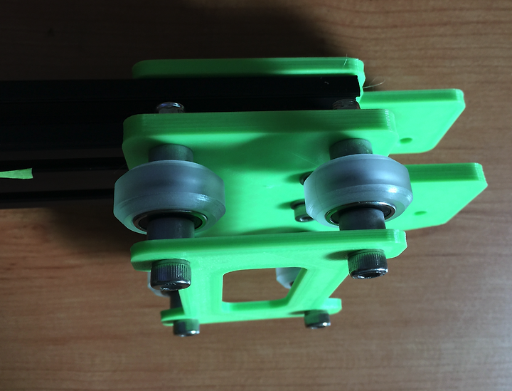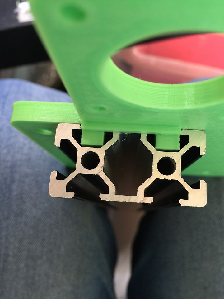 위의 사진은 esun PLA+로 새로 출력한 bracket으로 두께를 6mm로 키웠으며, 보시는 바와 같이 v-wheel 유격을 제거하기 위한 guide를 확인하실 수 있습니다. Profile을 중심으로 앞 뒤 bracket의 위치를 일치시키기 위해 프로파일 끝에 딱 걸리도록 턱을 만든 것도 디자인 시 고려 했습니다.