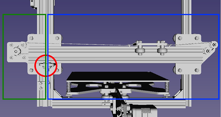 위의 그림은 Tarantula를 뒤에서 본 모양 입니다. 보시면, X축을 상/하로 이동시키는 구동 점은 빨간색 원 부분 즉, Z축 Rod에 물려 있는 rod nut 입니다. 이 위치가 X축의 무게 중심에 위치 하지 않는 문제가 있습니다. 그림에서 보면, 녹색 사각형 부분과 파란색 사각형 부분의 무게가 서로 다른 것이죠.. 녹색 박스 부분에 X축 구동 모터가 달려 있기는 하지만, 2040 프로파일의 무게 즉, 파란색 영역의 무게에 비하면 모터의 무게는 너무 가볍 습니다.