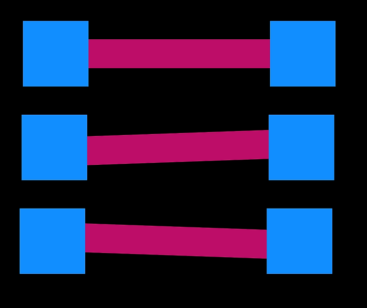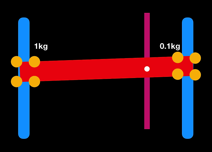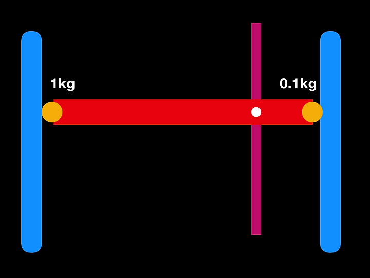 위의 도식은 Tevo가 취하고 있는 기구 설계 컨셉을 단순화 한 것인데, 좌/우 파란벽에 각각 하나의 노란색 롤러가 고정되어 있다고 가정할때, 분홍색 축을 기준으로 왼쪽이 1kg의 무게가 짧은 오른쪽에 0.1kg의 무게가 실려 있다면, 극단적이기는 하지만, 아래와 같이 1kg쪽으로 기울어 지게 될 것입니다.