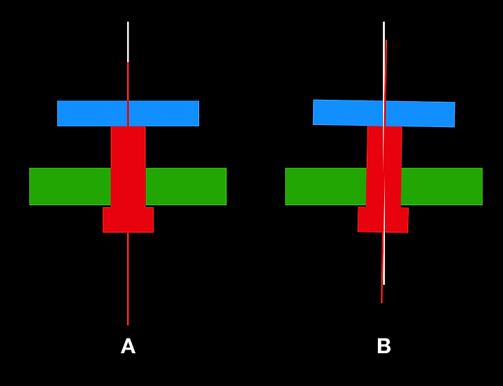 위의 도식에서 제일 위의 도식은 정확히 90도 각도로 수평을 이루고 있는 이상적인 상태이고, 중간과 제일 아래 도식은 브라켓과 프로파일이 90도 각도를 이루지 못해 결론적으로 기울어진 상태를 표현하고 있습니다.
