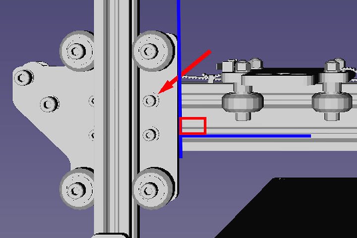 위의 그림은 새로운 X축 브라켓 설계로, 보시면 프로파일에 4개의 wheel이 체결될 때, 4개의 v wheel을 잡아줄 Bracket을 하나 더 디자인 한 것을 보실 수 있습니다. 위와 같은 디자인을 반영하면, 4개의 wheel 의 축이 변형되기 어려울 뿐만 아니라, 일부 wheel의 축이 변형되더라도 Profile에서 완전히 이탈하여 헛도는 상황을 개선시킬 수 있습니다.