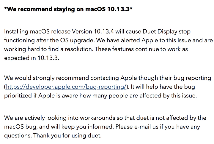 내용인 즉슨, macOS가 10.13.4 정식버전으로 업그레이드 된 후, 확인 결과 Duet Display가 정상적으로 동작하지 않는 것이 확인 되었으며, 이를 Apple에 통보했지만, 언제 버그가 수정될지는 미지수이며, 이 문제를 개선할 우회적인 방법을 강구하는데 노력하고 있다고 합니다.