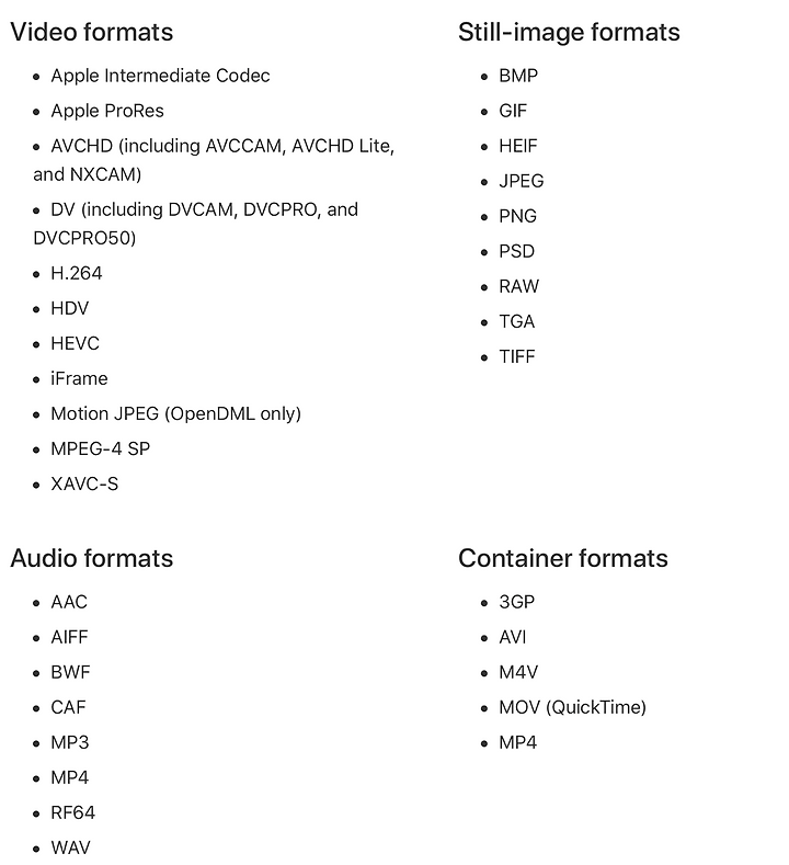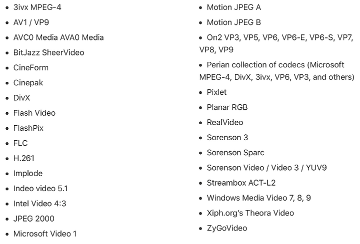 내용을 보면, 2019년 중반 까지는 Quicktime7 framework를 지원함에 따라 이전과 같이 동일하게 Legacy 미디어 포멧을 지원하지만, 이후로는 지원을 중단한다고 하는데요.. 이에 따라 지원이 중단될 포멧들은 아래와 같습니다.