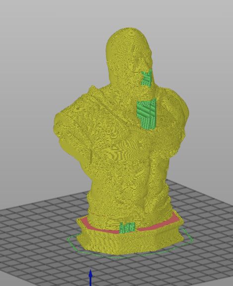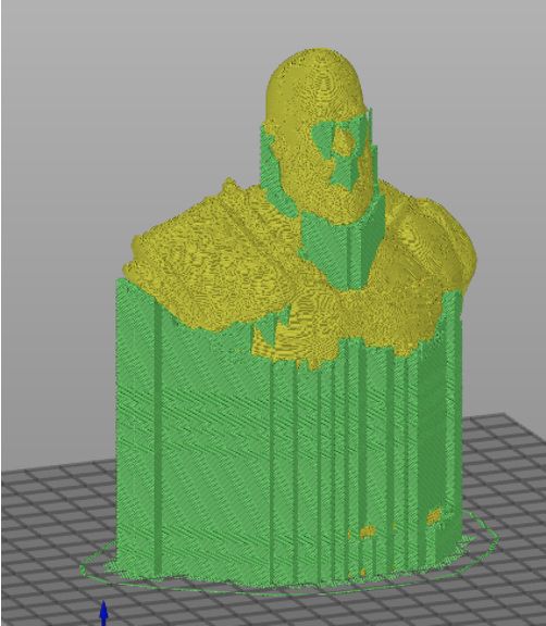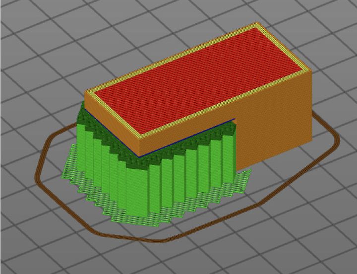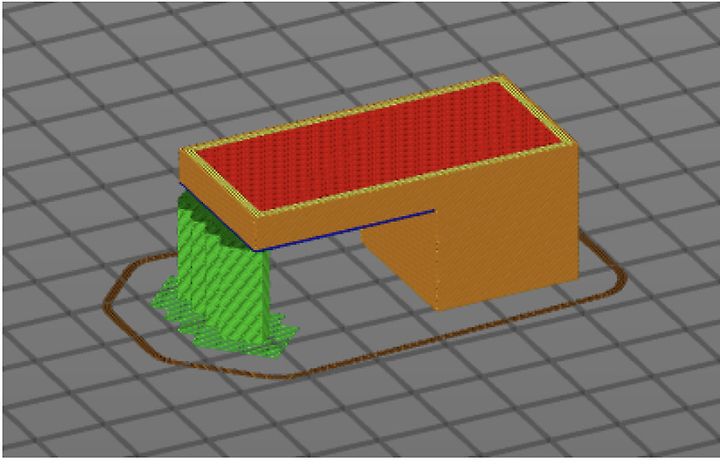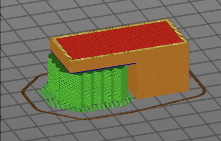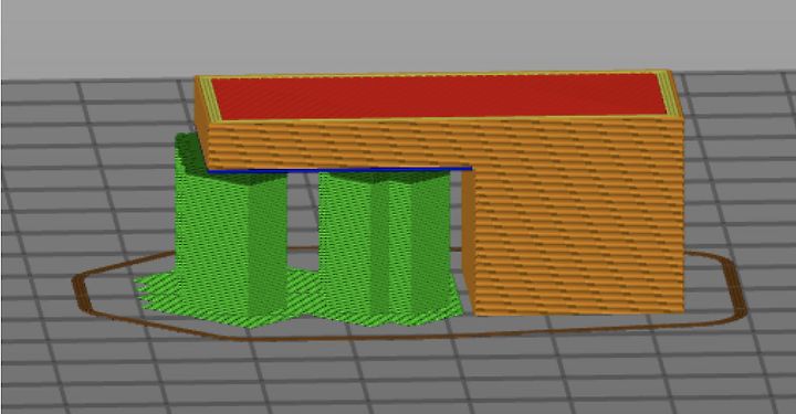 위의 스샷을 보시면, 파란색 영역이 Support Enforcer 영역이며, 벽돌색 부분이 Support Blocker 부분 입니다. Support 영역이 둘로 나뉘질것으로 예상을 해 볼 수 있습니다. 이제, Slice를 해 보면 결과는 아래와 같습니다.