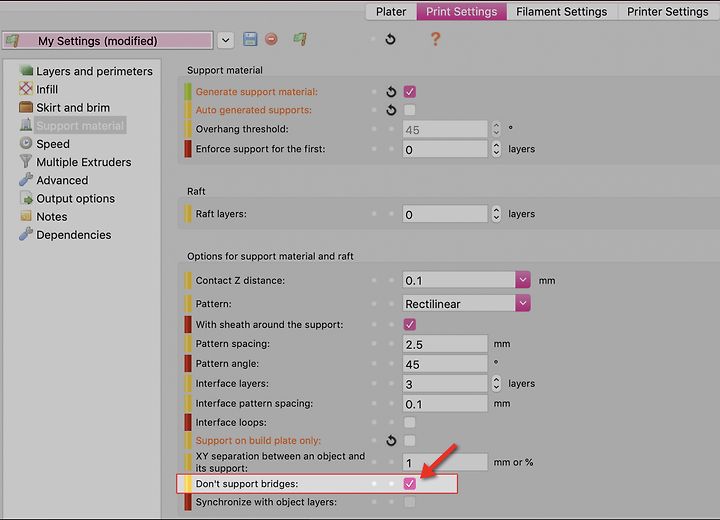 위의 스샷을 보시면, Print Settings > Support material > Option for Supports 항목 중에 Don't support bridges 가 ON 되어 있는 것을 보실 수 있습니다. Bridge 영역에는 Support를 만들지 말하는 의미이죠.. 따라서, 이 옵션을 OFF(끔) 하면, Bridge 영역에도 Support를 만들게 됩니다. 이 옵션을 OFF 시킨 후 결과를 보면 아래와 같습니다.