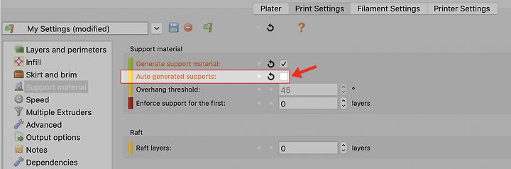 이 4번째 Step이 중요 한데요.. 사용자가 설정한 Support Enforcer 영역에만 Support를 만들려면, 우선 Slic3r의 Auto generated supports 기능을 OFF 시켜야 합니다. 이는 Print Setting > Support Material 에서 설정해 주면 됩니다.