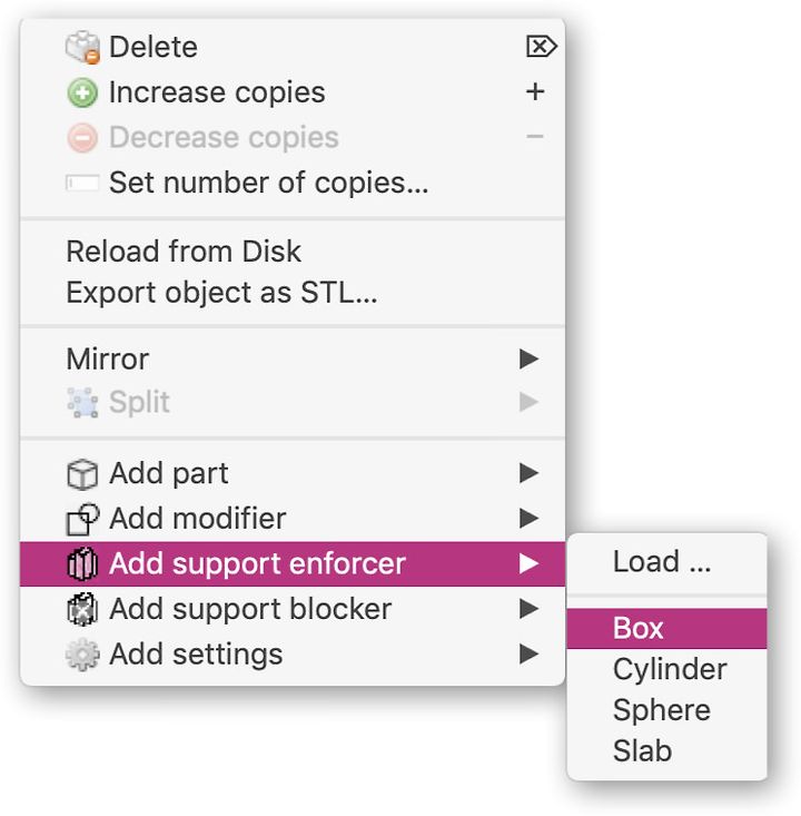 모델(Object)이 선택된 상태에서 마우스 오른쪽 버튼을 누르게 되면, 아래와 같이 Contextual Menu 가 나타나게 되는데, 여기서 아래와 같이 Support Enforcer를 선택합니다. 그러면, Sub menu가 나타나는데, Load(불러오기), Box(상자), Cylinder(원 기둥), Sphere(구), Slab(길쪽한 판) 들 중에 선택을 할 수 있도록 되어 있습니다.