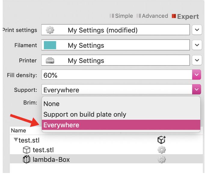 그리고, Plater로 돌아가서, 아래와 같이 Support를 Everywhere로 변경해 줍니다.