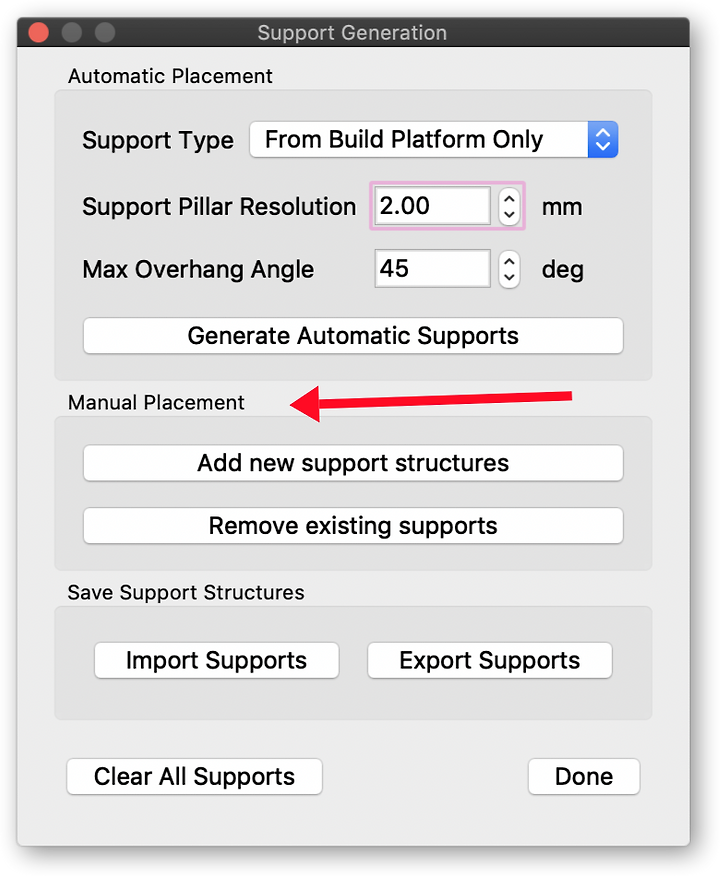 따라서, 가장 좋은 해결 방법은 사용자가 직접 원하는 Support 위치를 결정하고, Support 생성 여부를 설정하는 것 입니다. 이것을 자동이 아닌 수동으로 Support를 만든다고 하여 Manual Support(메뉴얼 서포트) 기능이라고 하죠.. 이러한 Manual Support 기능은 모든 Slicer들이 제공하는 것은 아닙니다.