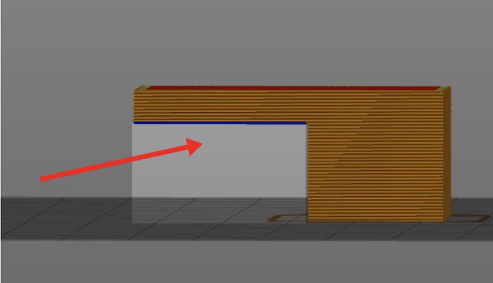 바닥면 부터 순차적으로 Layer를 적층해 나가다가 화살표가 가르키는 Layer에 다다르면, Overhang이 발생하게 됩니다. 즉, 공중에다가 출력을 해야 하는 것이죠..