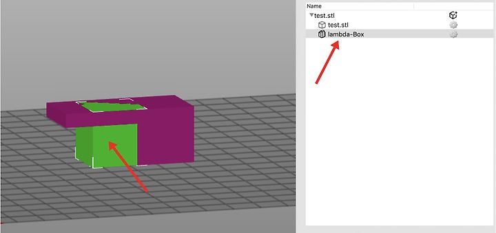 Box를 선택하면 Plater에 Box가 새로 생성되고, 좌측의 Project 상세 창에는 Test.stl 모델과 별도로 lambda-Box라는 요소가 생성된 것을 보실 수 있습니다. 새로 생성된 Support Enforcer를 지칭하는 것입니다.