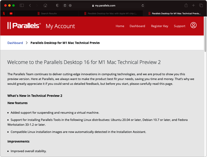 로그인을 했으면, M1 칩용 Parallels Technical Preview 버전을 다운로드 받을 수 있는 링크로 이동합니다.