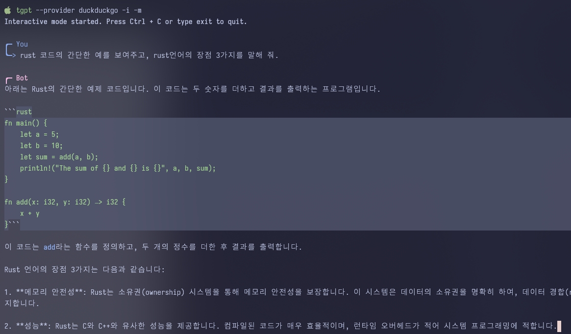 chatGPT 를 이용하기 위해 무거운 web-browser를 실행할 필요가 없이, 간단하게 terminal에서 빠르게 사용할 수 있다는 것이 가장 큰 장점이며 한국어 사용에도 무리가 없다는 점도 좋습니다.